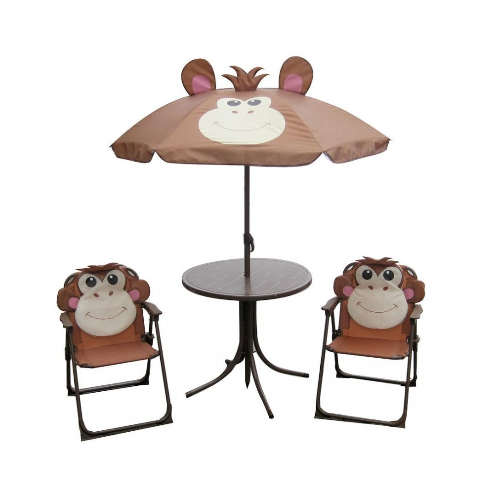 Detský záhradný set Melisenda je vhodný na záhradu, terasu či kempovanie. Pozostáva z 2 stoličiek a 1 stola so slnečníkom. Záhradný set je vyrobený z kovu a textílie a je ľahko zložiteľný. Určené do 30 kg dieťaťa. Farba : hnedá s motívom opice. Doprajte svojim deťom krásne sedenie v prírode.