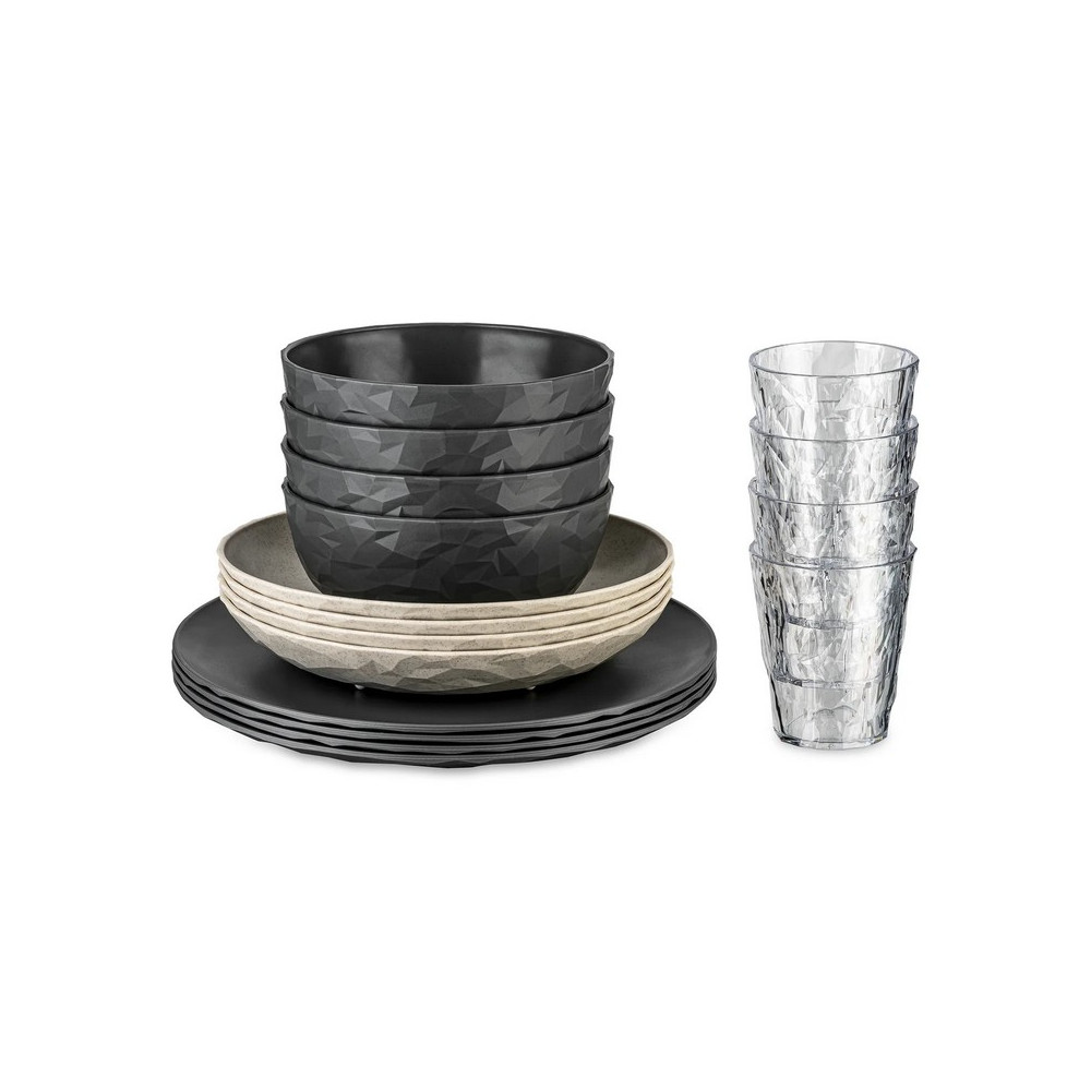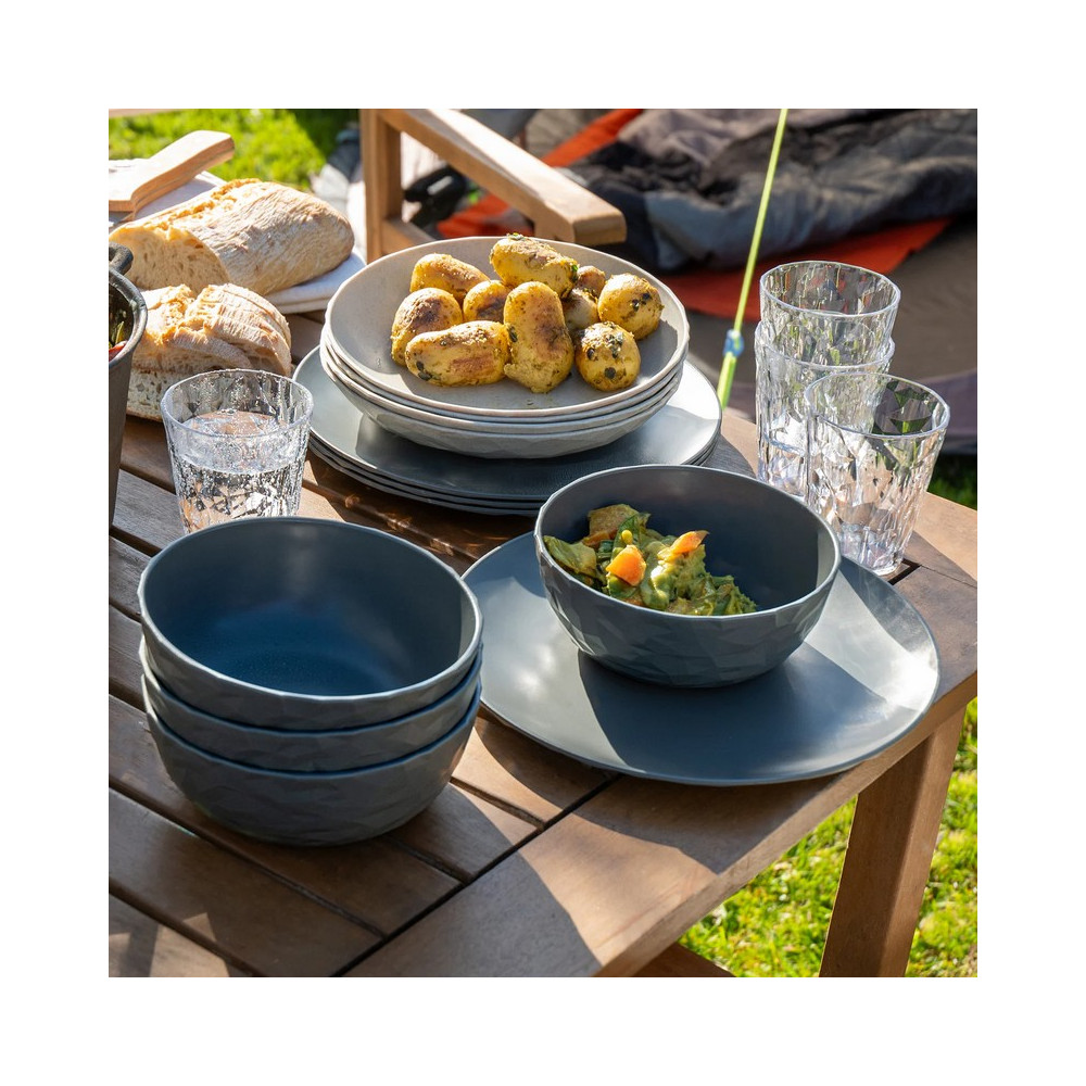 Dokonalá základná sada pre všetkých kemperov a tých, ktorí sa nimi chcú stať. Taniere, misky a hrnčeky s výrazným fazetovým dizajnom sú perfektným základným vybavením pre váš ďalší kempovací výlet. Všetky diely sú odolné voči rozbitiu, stohovateľné, ľahko sa čistia a dokonca vydržia jazdu po štrkových chodníkoch bez poškriabania.