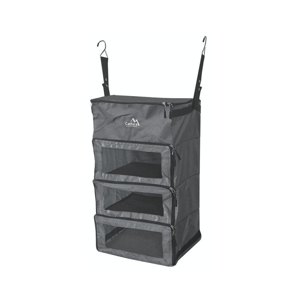 Na uchytenie sú súčasťou dva kovové háčiky, ktoré umožňujú ľahké zavesenie za akúkoľvek hranu, tyč či konštrukciu stanu. Po použití je možné organizér rýchlo zložiť a ľahko prenášať.