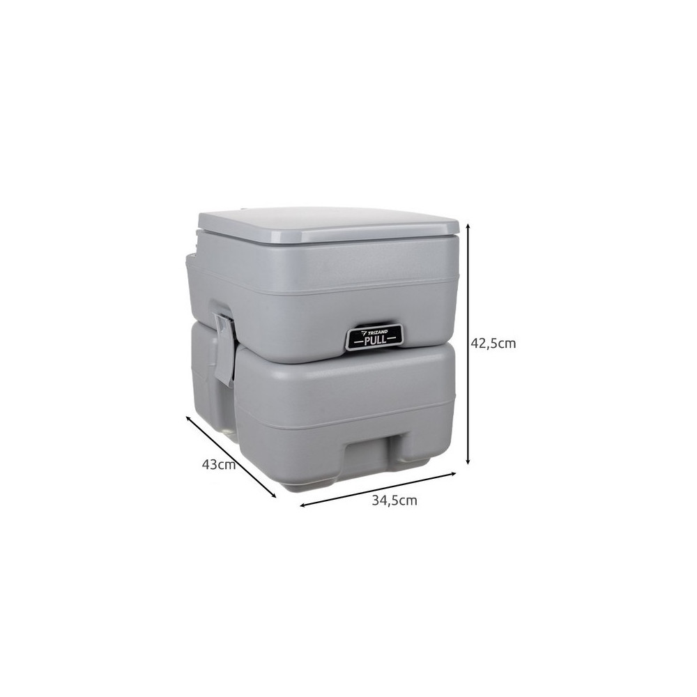 ŠPECIFIKÁCIA: farba: šedá; materiál: HDPE, ABS, PP, guma; objem odpadovej nádrže: 20l; objem nádržky na vodu: 12l; nosnosť: 150kg; rozmery: 42,5 x 34,5 x 43cm; vnútorný priemer sedadla: 25,5 x 22cm; hmotnosť: 4,3 kg; hmotnosť balenia: 5,1 kg