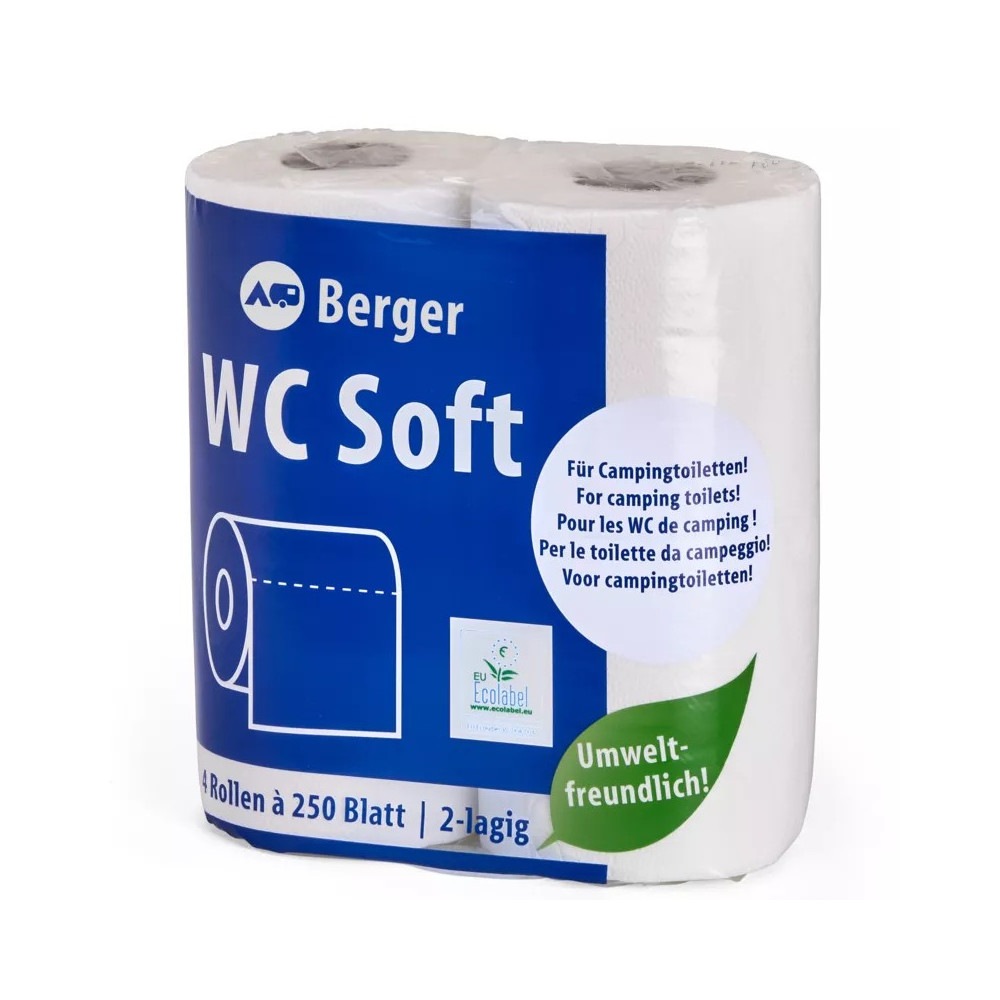 Toaletný papier Berger WC Soft je špeciálnym riešením pre obytné automobily a karavany vďaka svojim ľahko rozpustným vlastnostiam a mäkkosti. Tieto vlastnosti minimalizujú riziko upchatia toaliet a kanalizačných systémov a sú tiež šetrné k životnému prostrediu.