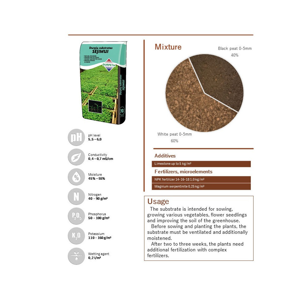 výsevný substrát, určený na siatie semien, pestovanie rôznych druhov zeleniny, pestovanie klíčkov a úpravu pôdy v sklenníkoch